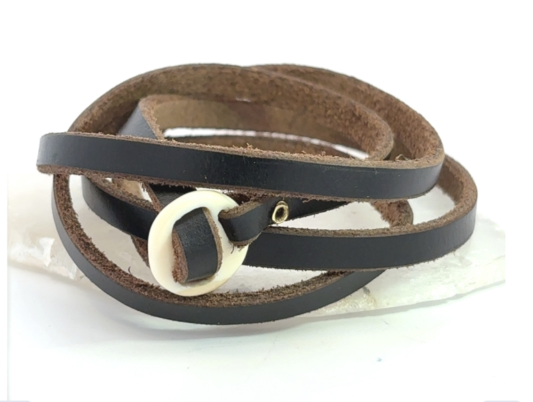 Leather wrap Bracelet/Bolo, Handcarved Fossil Walrus Ivory, brass rivet, Bolo/Bracelet in black leather