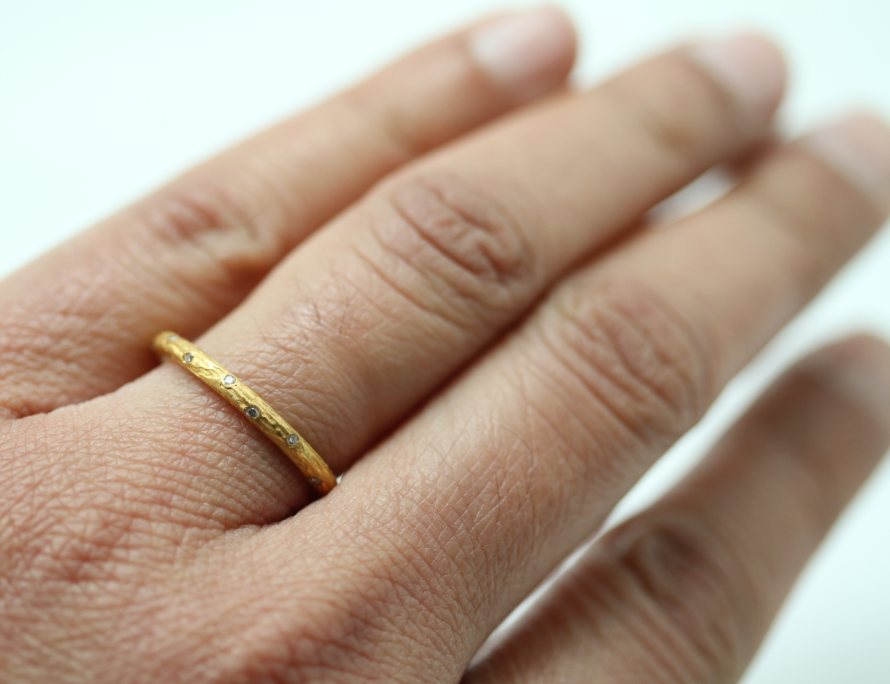 Textured round 24K gold band with flush set diamonds. Size 7. This can be made to order, price will vary with gold spot price.