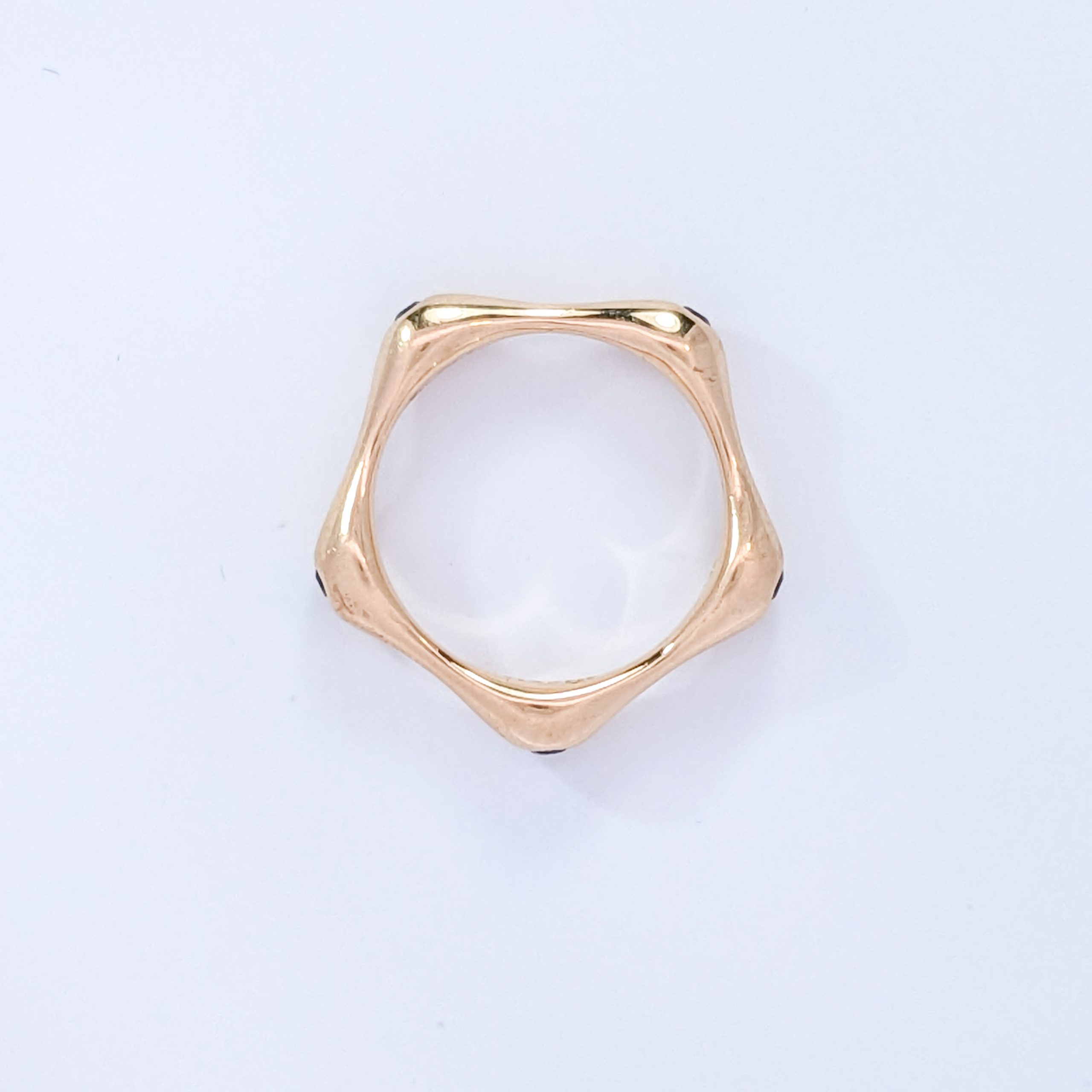 This ring is inspired by the ancient Japa technique for contemplative thought and represented by five affirmations that can be determined by the wearer. 18k yellow gold with five Ceylon natural blue Sapphires. Size 5.5