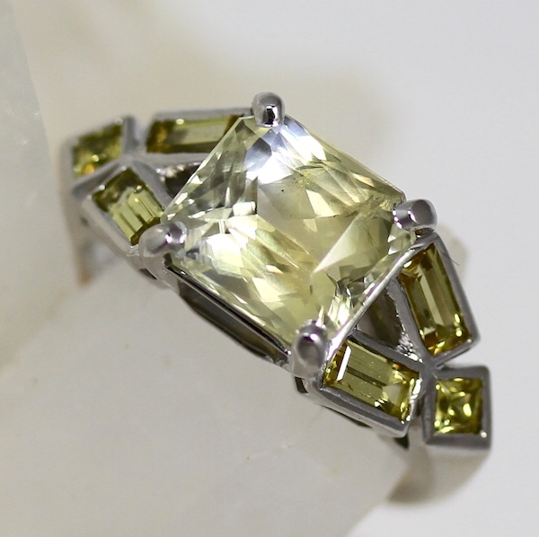 Custom engagement ring with Yellow Sapphires set in geometric, Art Deco style.