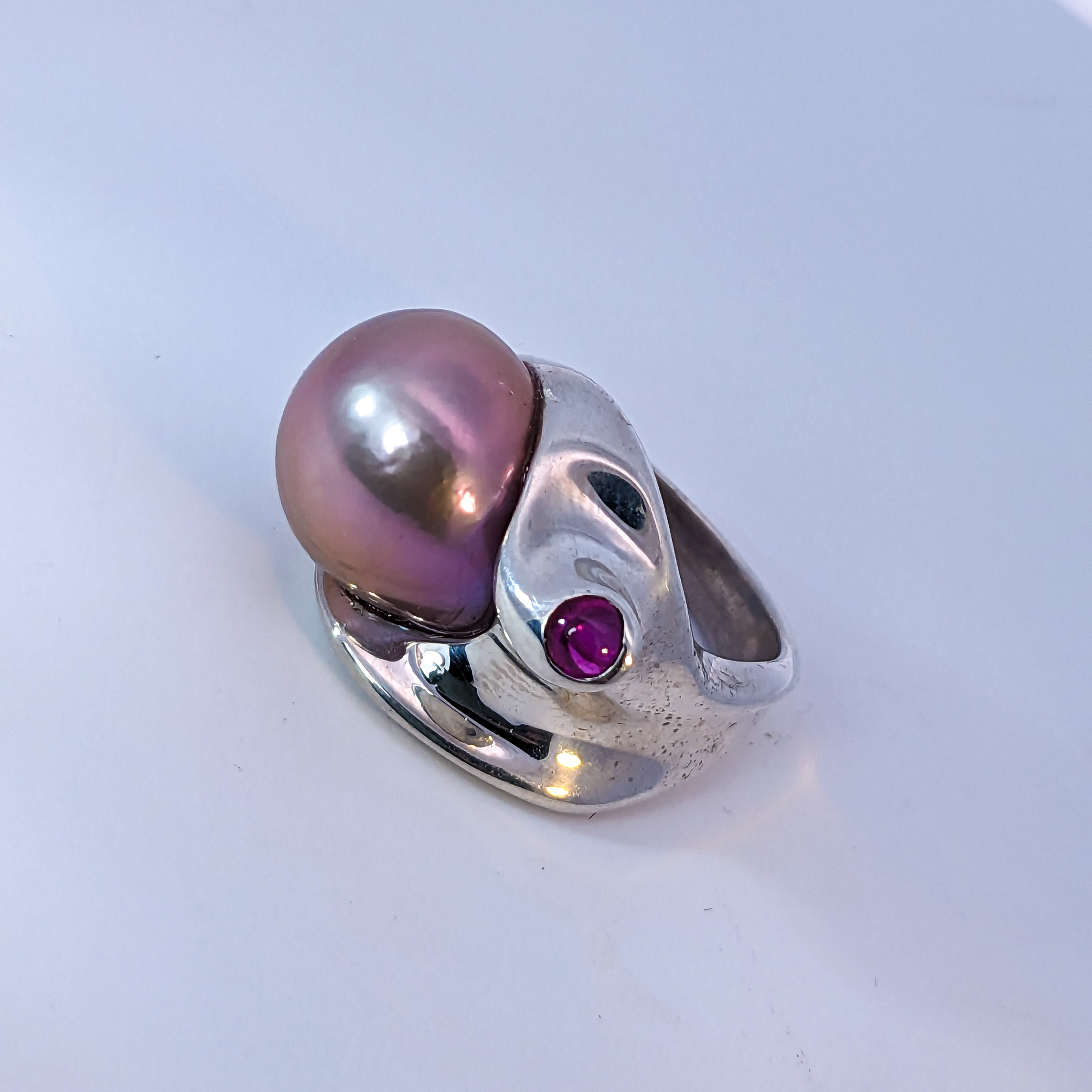 Baja shell fragment ring set with a natural lilac color 13mm Freshwater Pearl and Ruby ring, sterling silver size 6.5