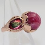 Custom man’s ring with boulder opal and flush set hexagon emeralds in 14KT yellow gold.