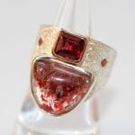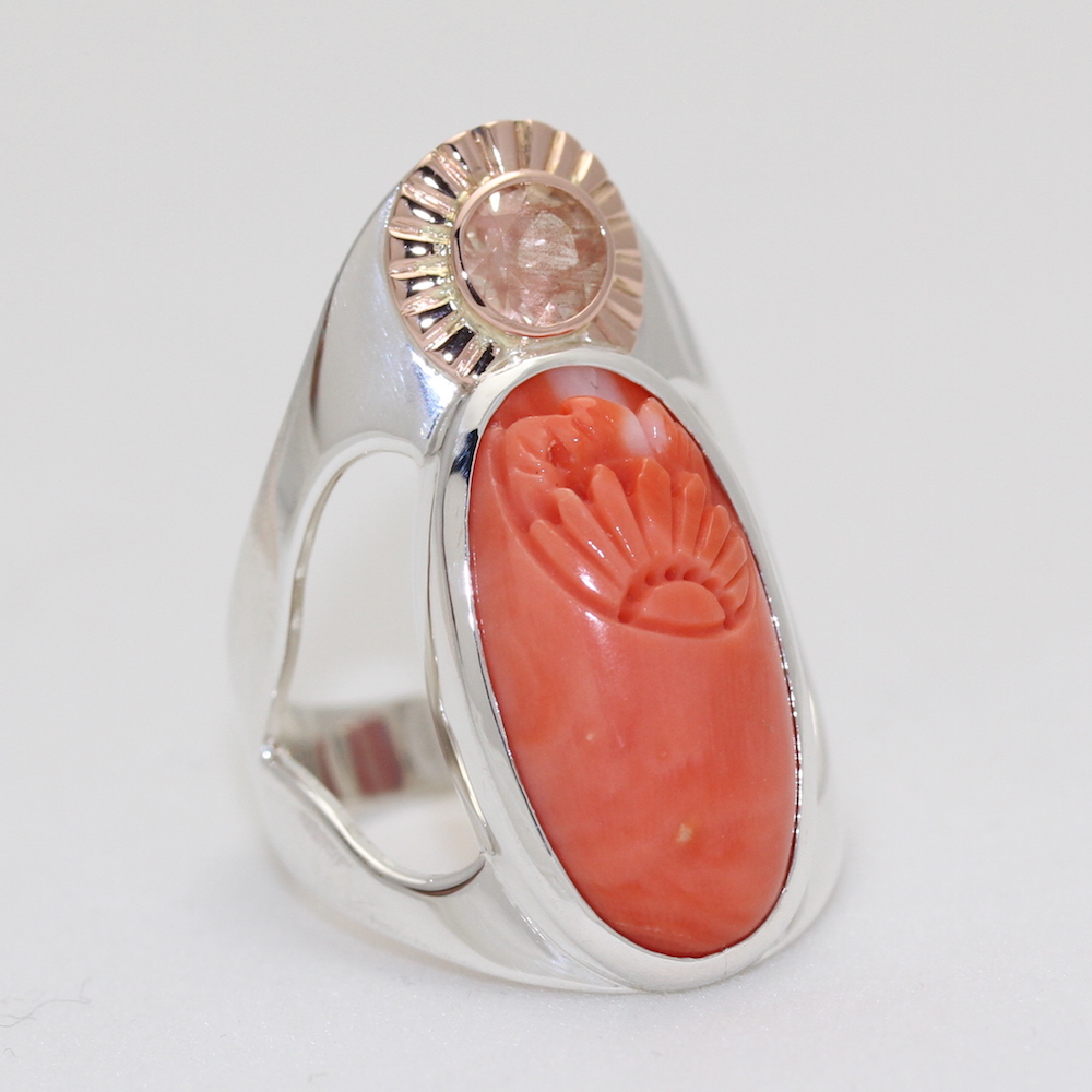 Custom carved Italian coral ring with sunstone, sterling and 14KT pink gold.