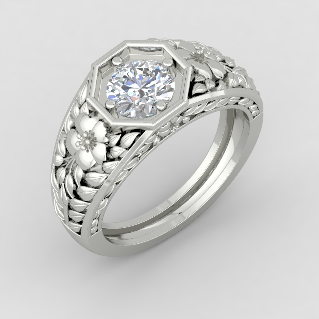 Client wanted to incorporate Georgia’s state flower, the Cherokee Rose, and his wife’s compass tattoo into one symbol of enduring love. Modern computer automated design (CAD) was utilized to achieve the Art Deco motif he desired. He had three diamonds from his mother’s wedding ring that we used. 14KW.