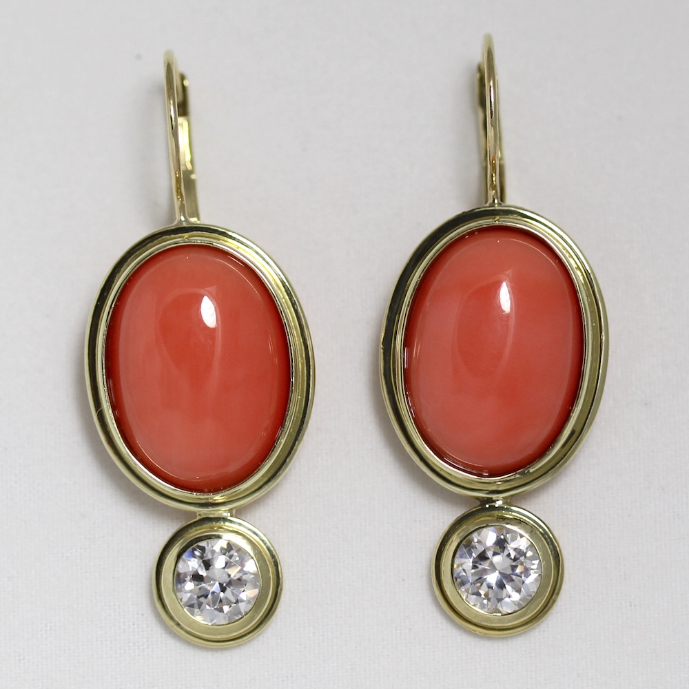 Custom 14KT yellow gold, Italian coral cabochons and diamonds.