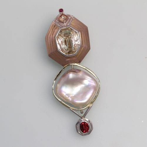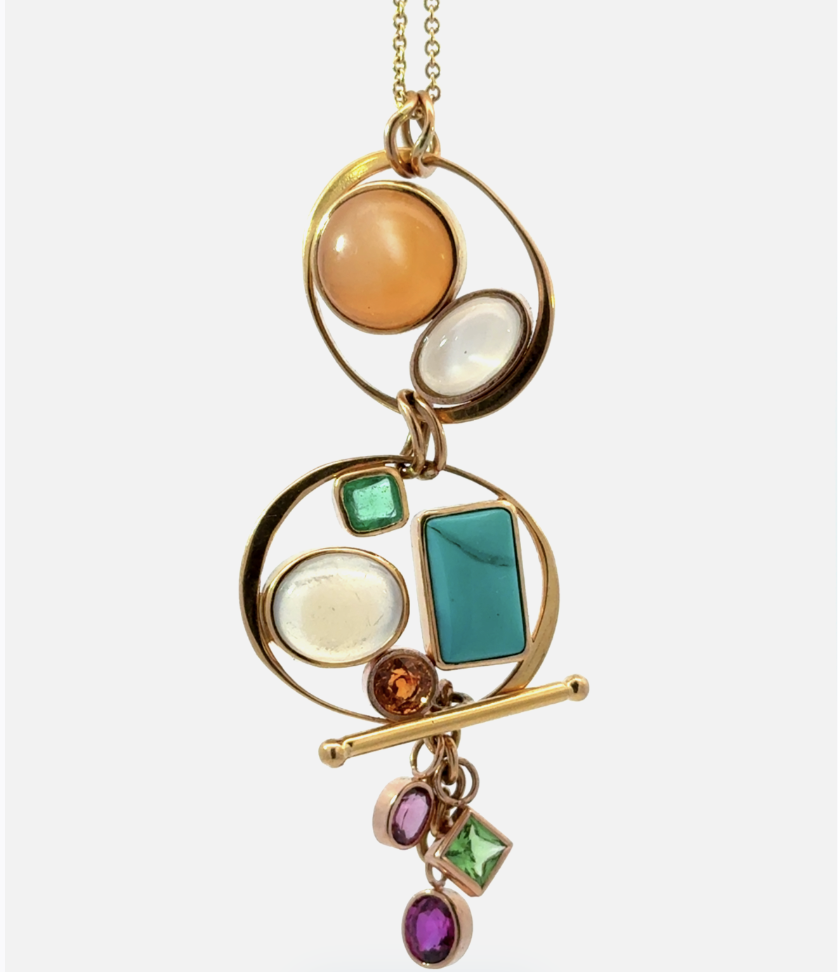 Currents of the Deep Necklace, set with Faceted Diopside weighing 2.80ct, Drusy Uvarovite, Fossil shark tooth set in 14k yellow gold on double strand Tsavorite Garnet with 14k yellow gold lobster clasp.