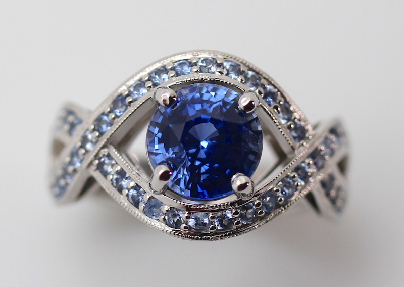 Natural blue Sapphire low profile engagement ring featuring a weaving band, symbolizing two rivers of life joined as one. Shared-prong pale blue Sapphires set in Platinum.