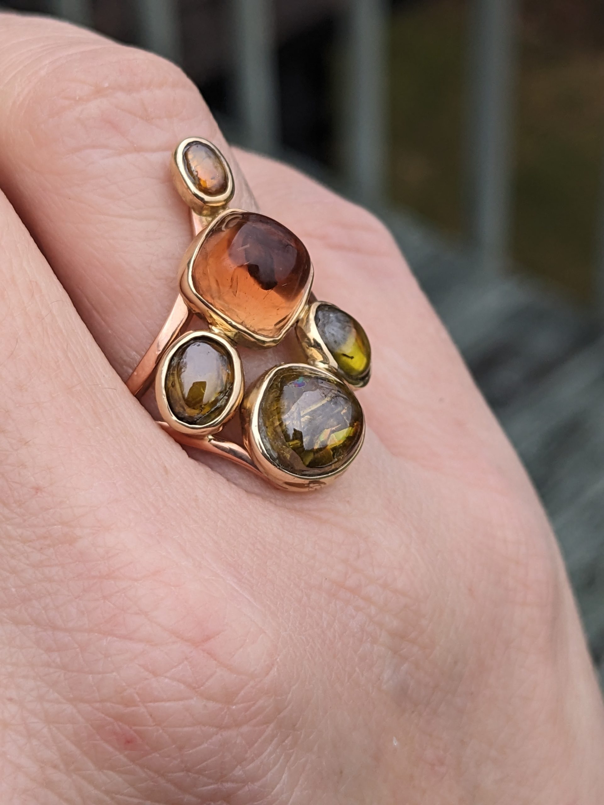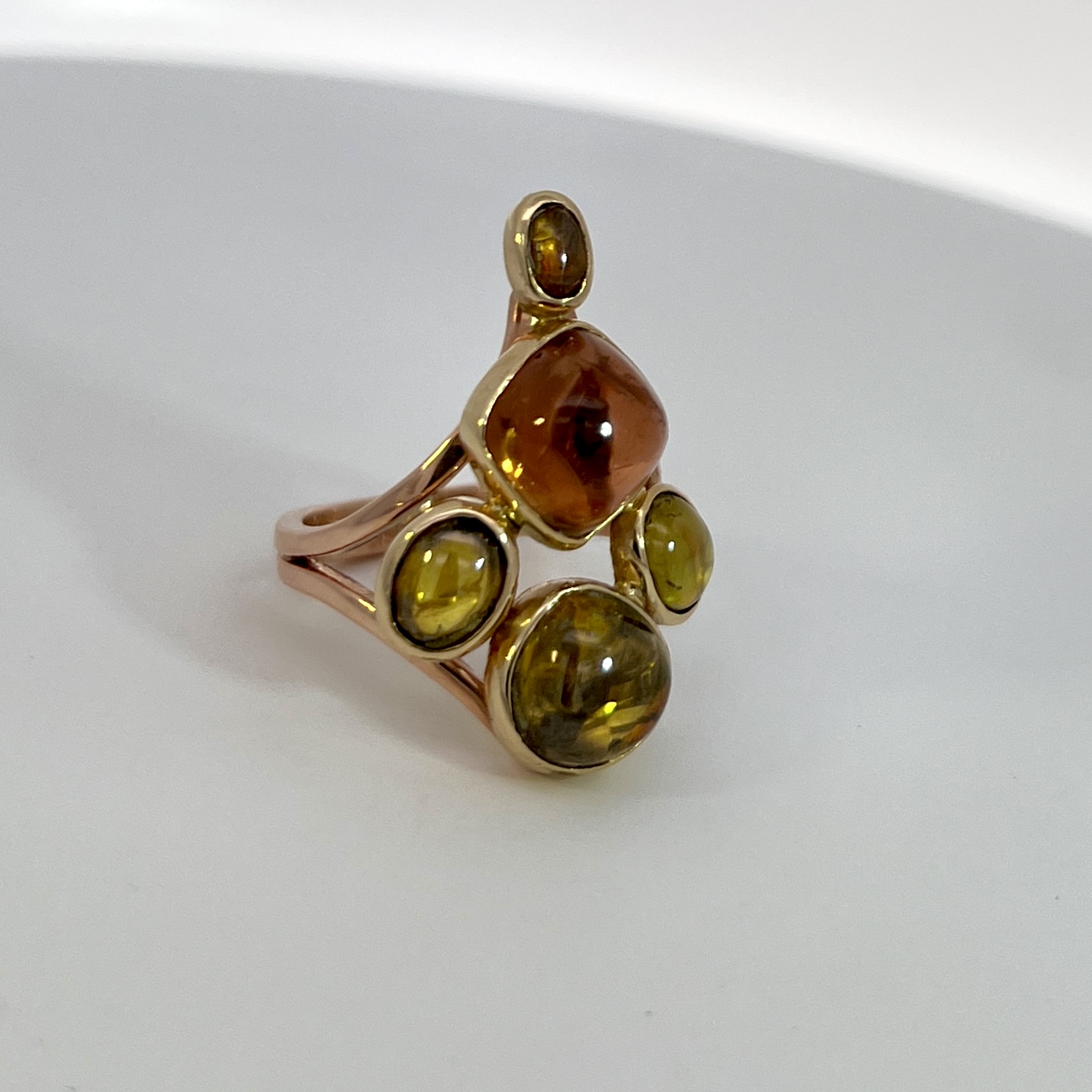Ginko Leaf Ring, Rare Sphene (4) and Peach Tourmaline (1), Split Band, 14K Apricot and green Gold, size 6.5