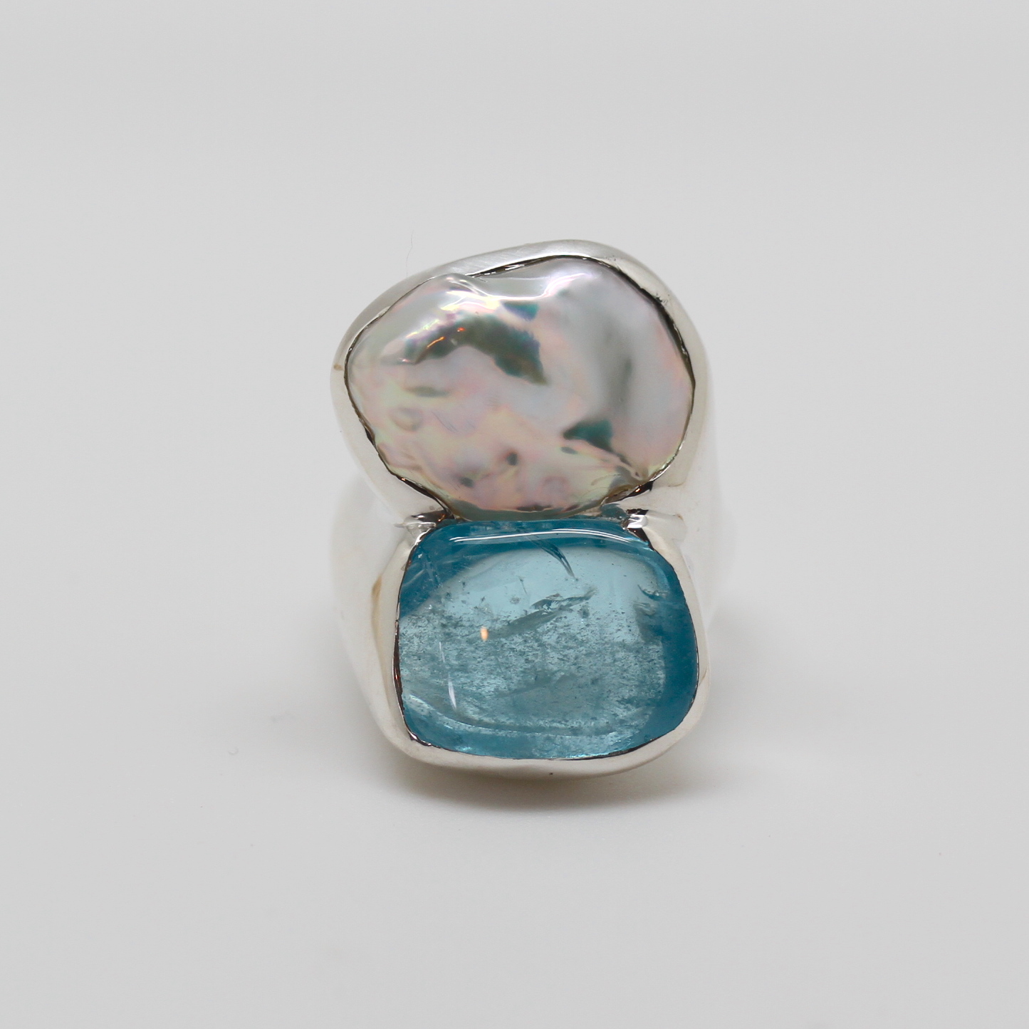 “Who Will Remember the Ice?” Series. White Keshi Pearl, Aquamarine, size 8.