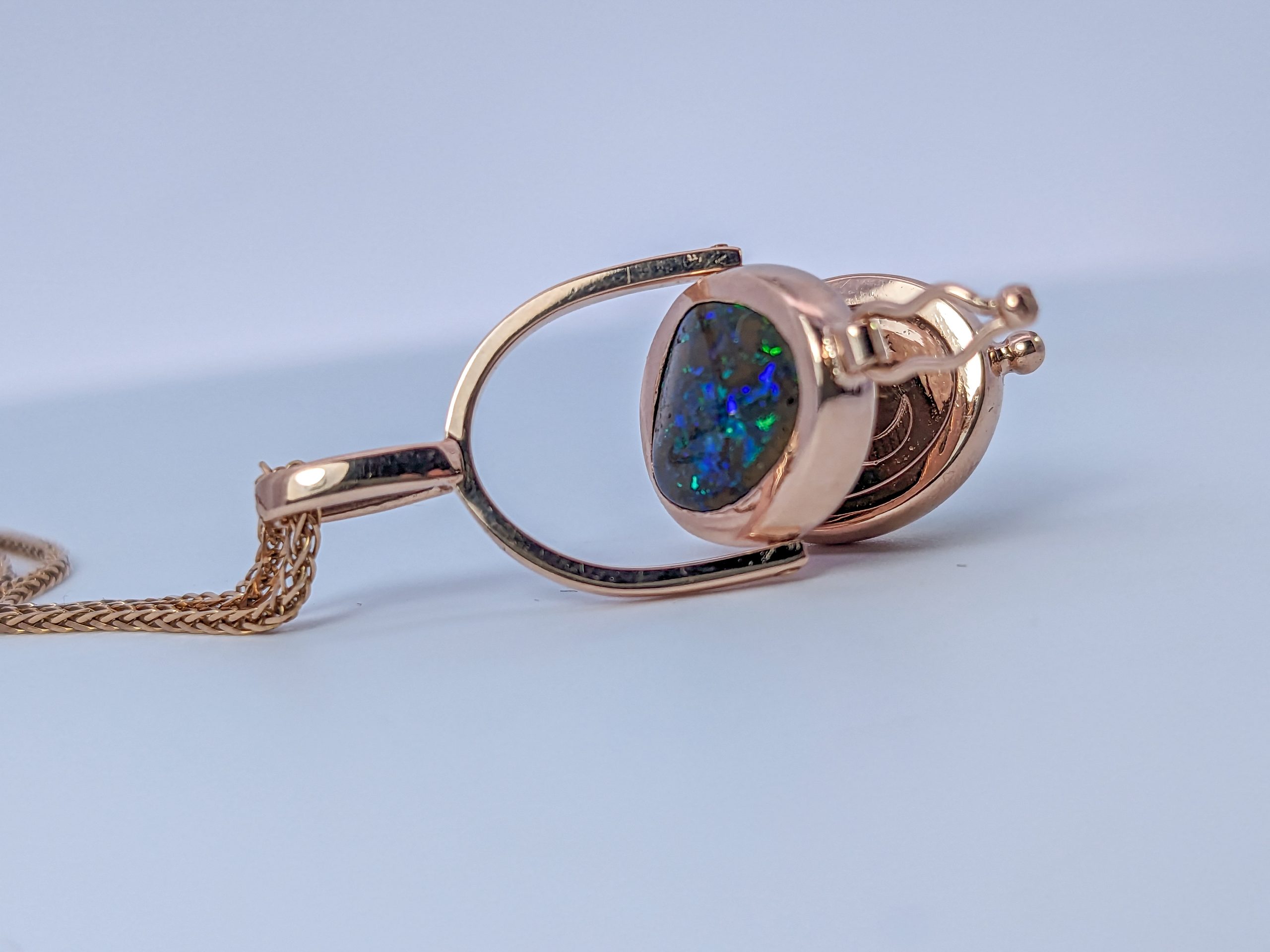 “Green Fire” Love Locket II; Two sided locket spinning on it’s own axis that opens, featuring 1.28ct Natural Oval Emerald Cabochon, 2.00ct Australian Boulder Opal. 14k Rose gold, engraved with a moon and twinkling stars on the inside. 1″ long