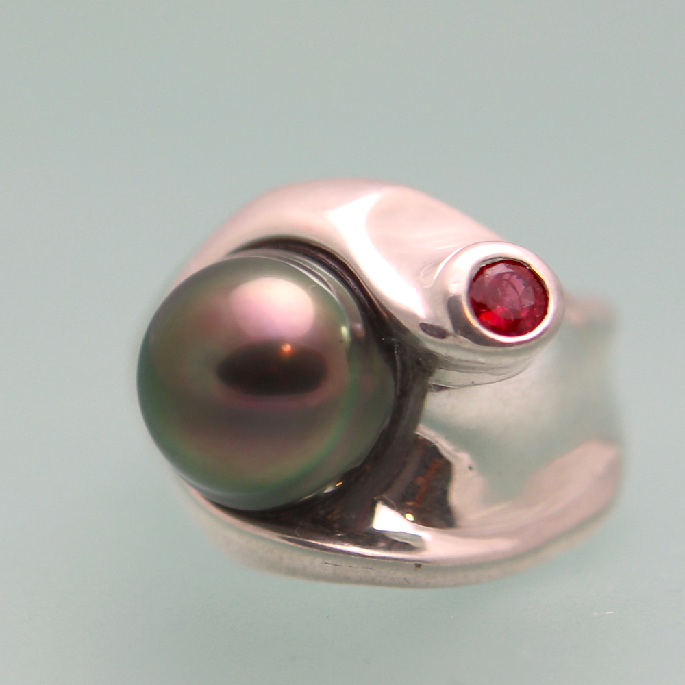 Custom sterling “Horizontal Baja” ring with grey Tahitian pearl and red spinel.