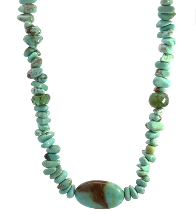 Oval Kingman Turquoise Bead, with two Green Tourmaline, Turquoise nugget Necklace, Sterling Silver Lobster Clasp, Length 17.5″