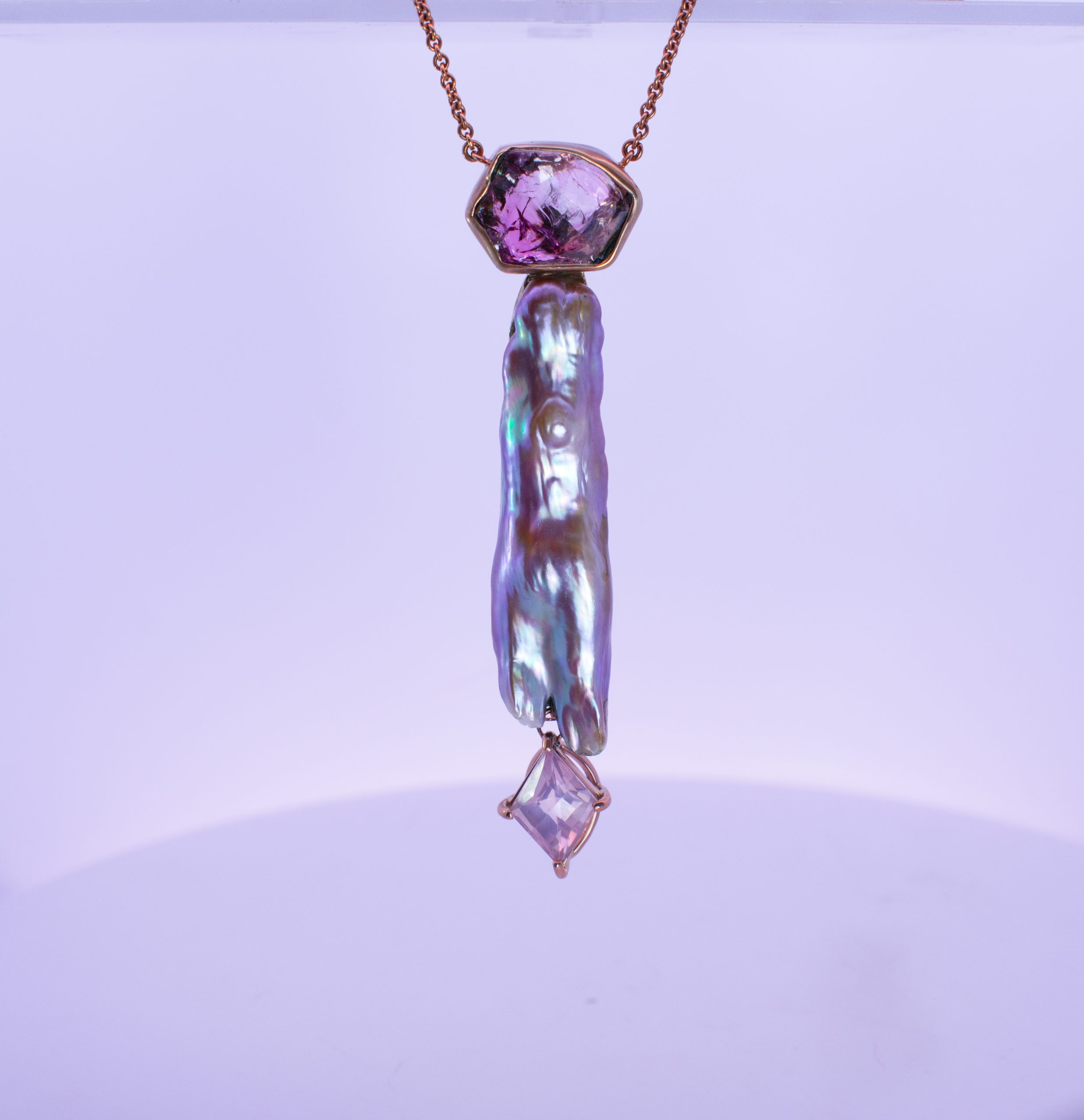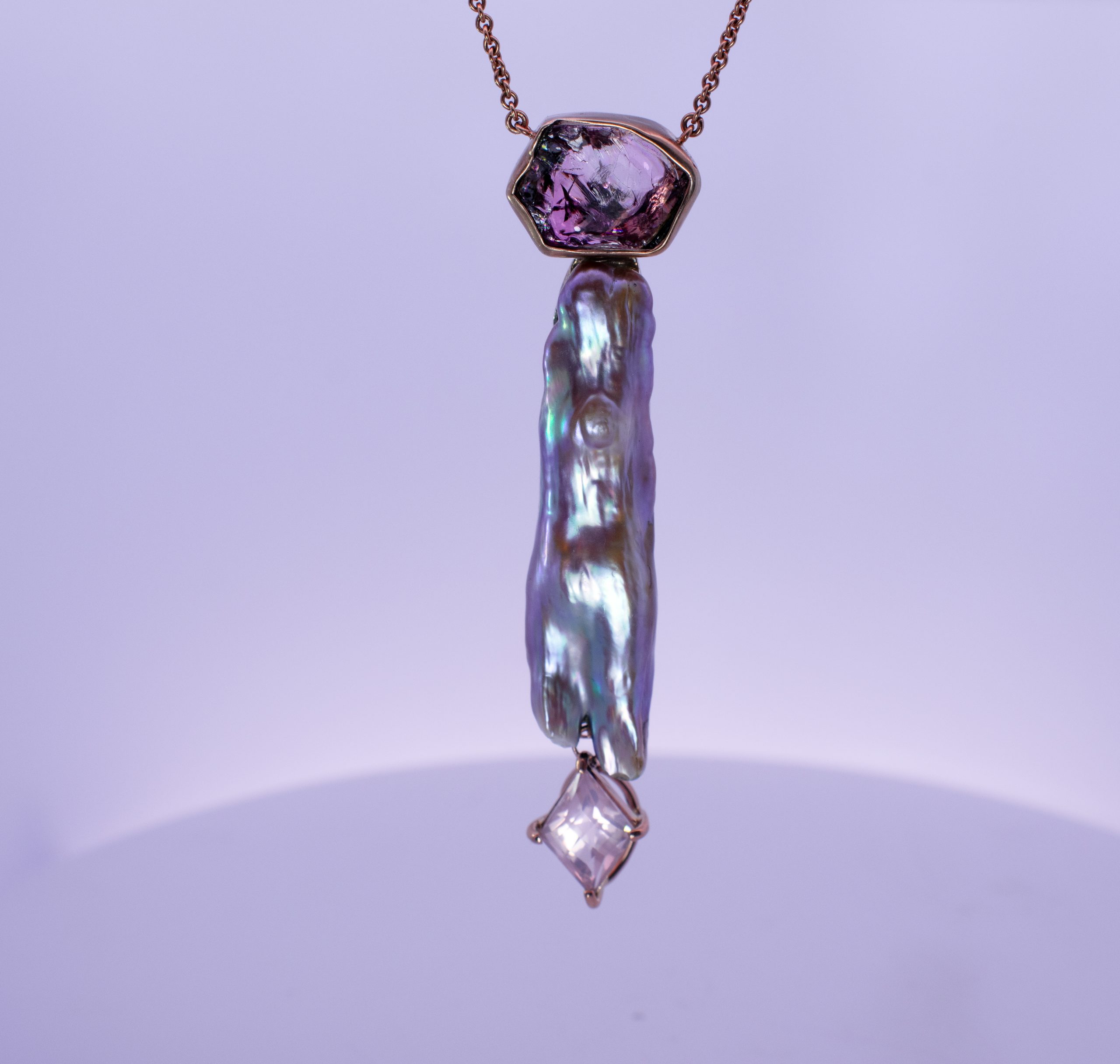 Home » Shop » Bespoke Necklaces » “Lady Winter Series” Red Pine in Snow, Raw Pink Tourmaline Crystal, Keshi Pearl, Kite Rose Quartz set in 14k Rose Gold, Sterling. 16.5” Long