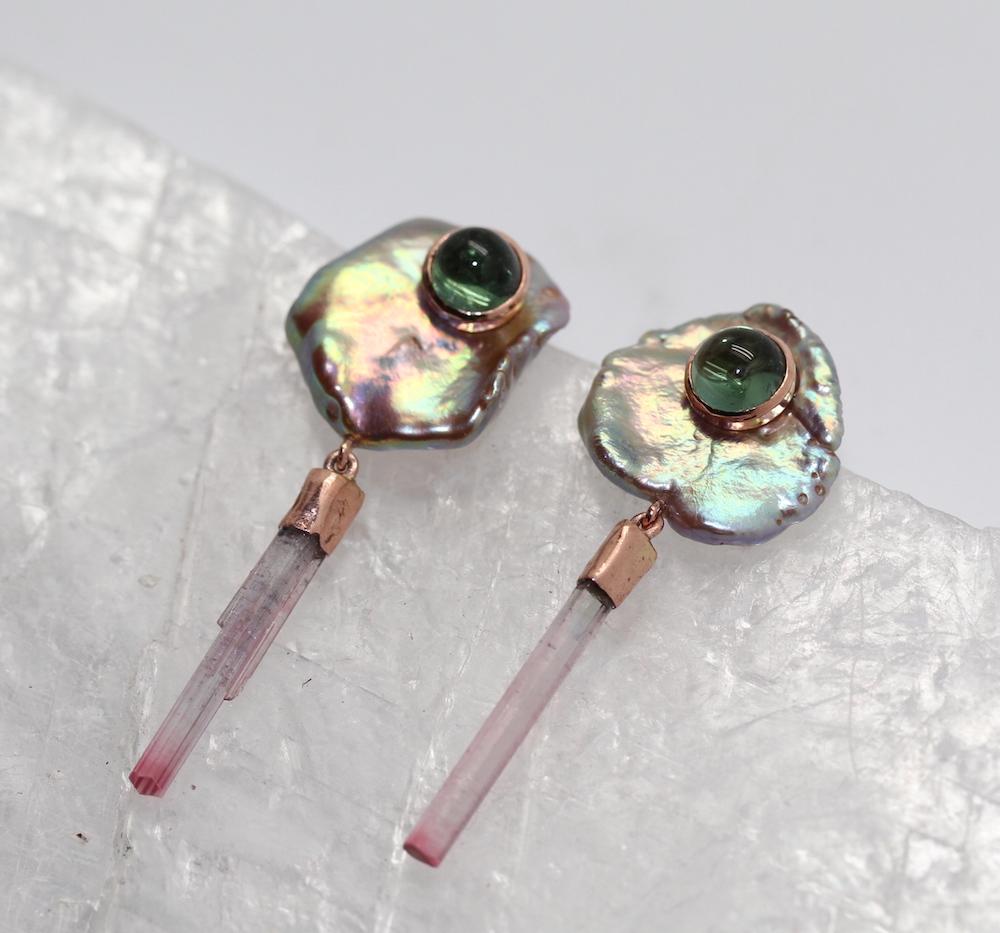 Multicolor Freshwater Pearl, Green Tourmaline, Bi-Color Tourmaline rods. 14K Rose Gold.