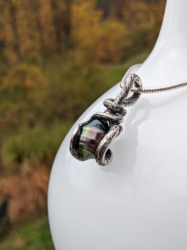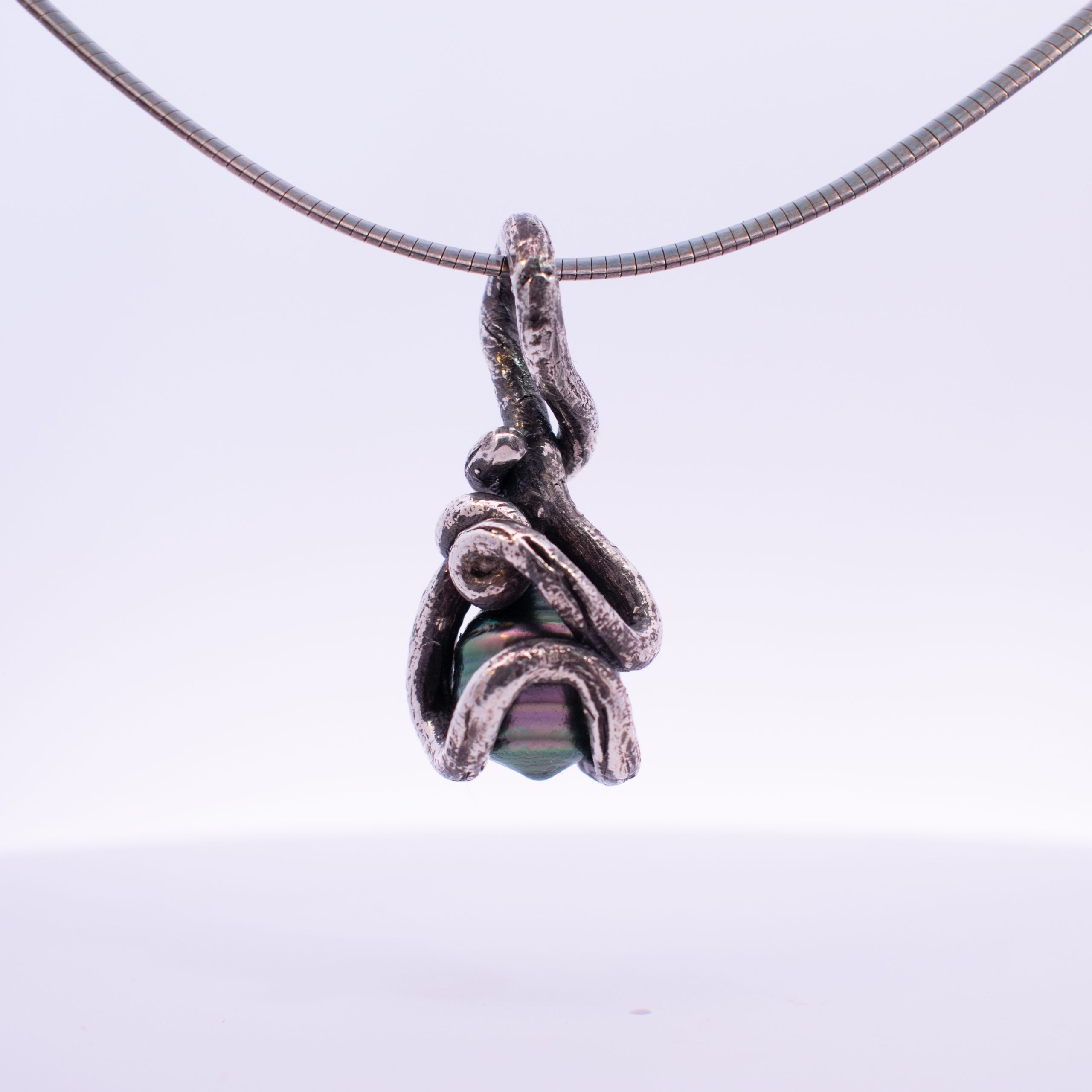 “Ouroboros Pearl Pendant” Tahitian Pearl with Twisted Vine Pendant, Sterling Silver