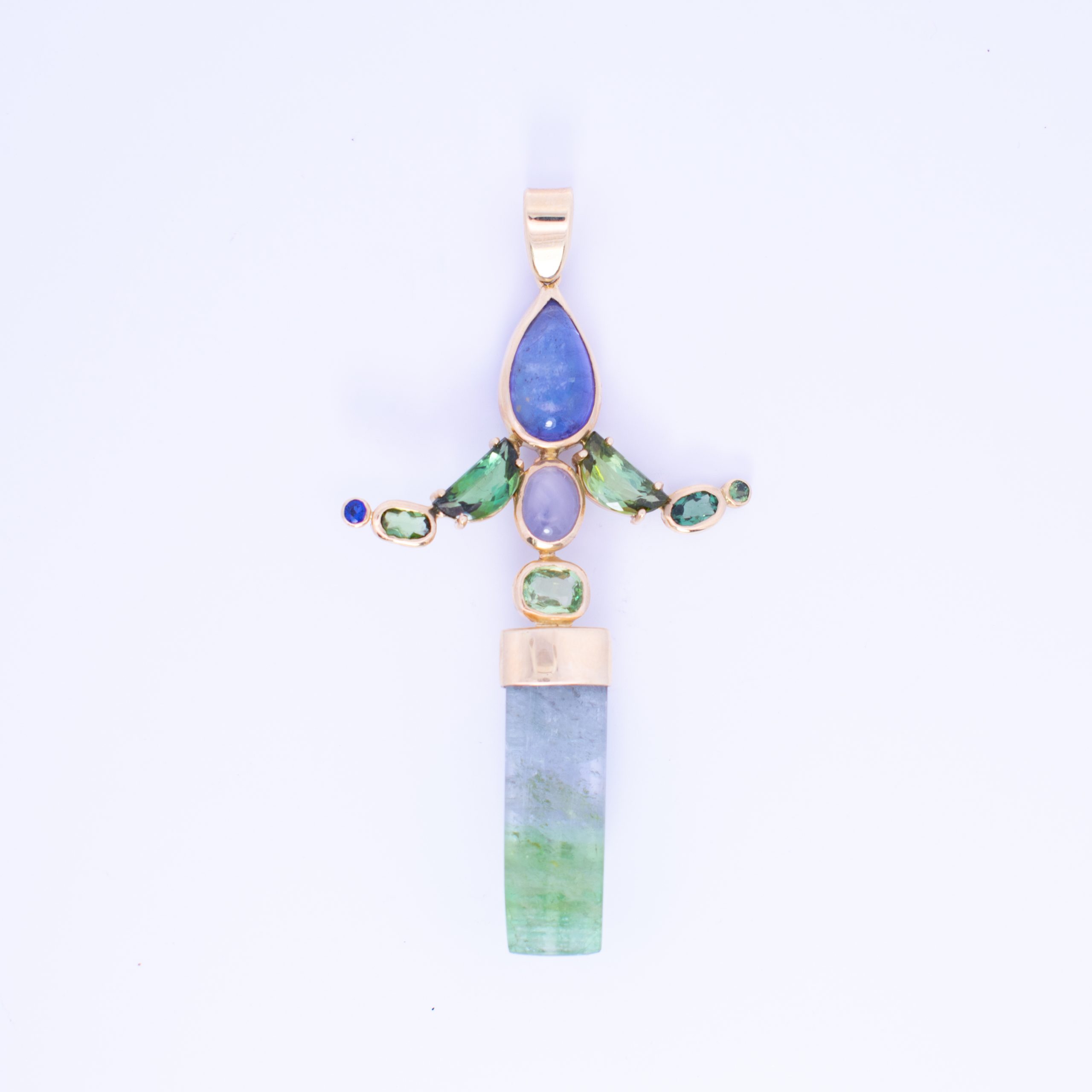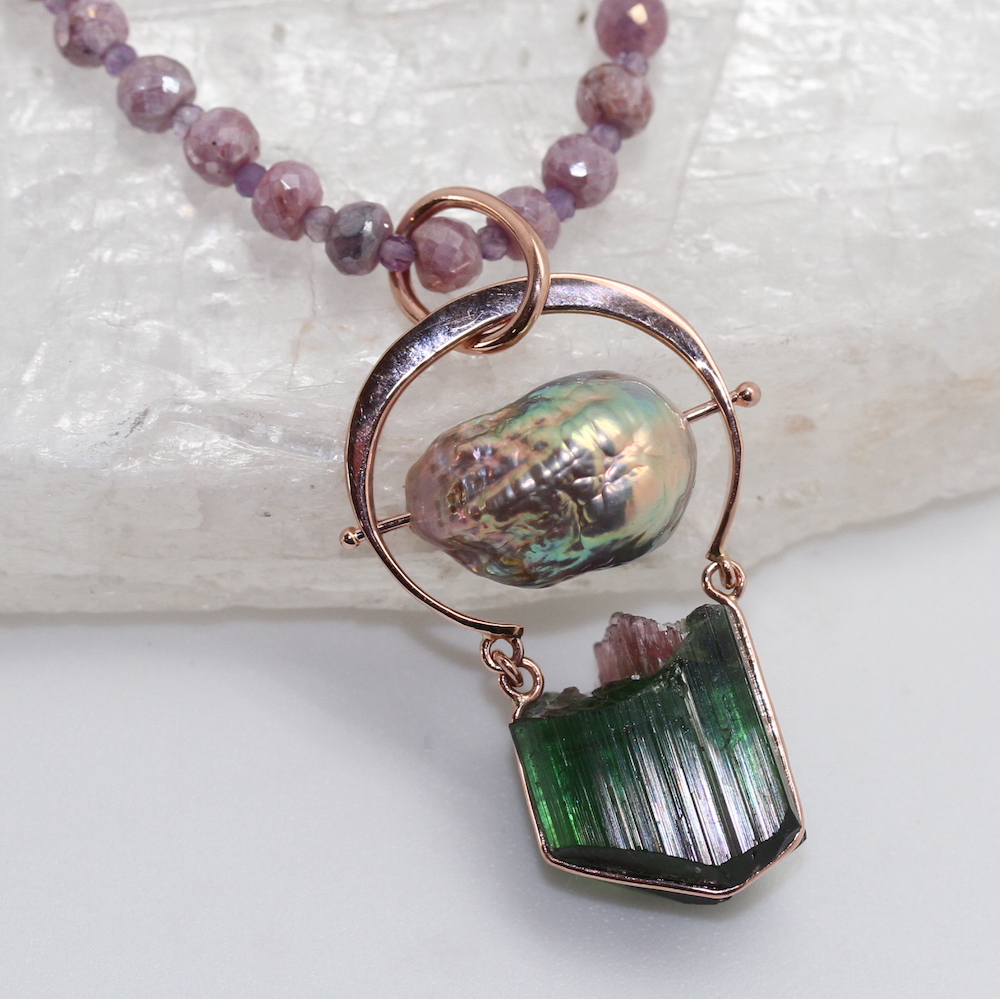 14KP, Firecracker freshwater pearl, Green/Pink Watermelon Tourmaline Crystal. Can be ordered with yours or my crystal. Price on request.