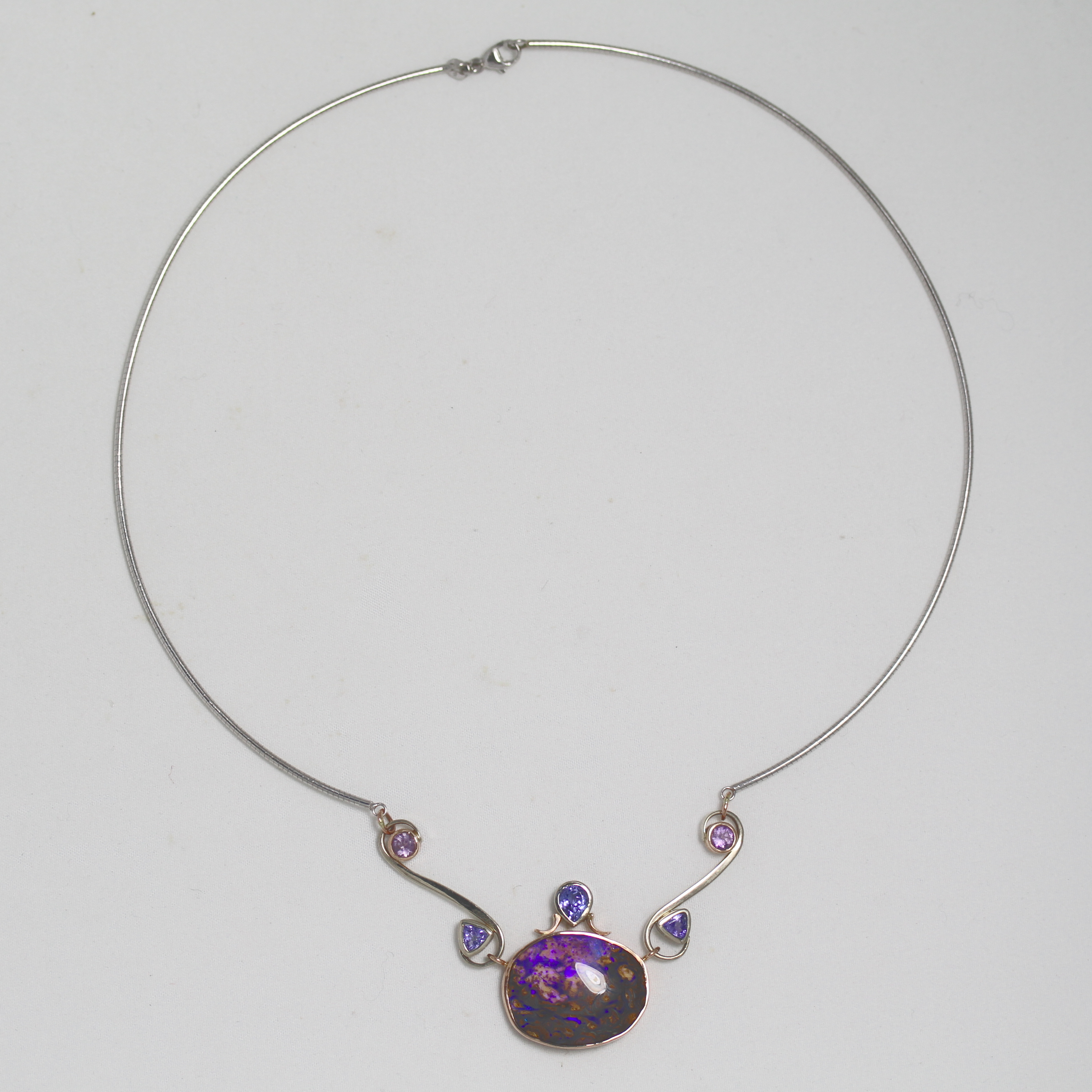14K White and Yellow Gold Agean Link, Tanzanite, Purple Sapphire, Purple Fire Boulder Opal Necklace.