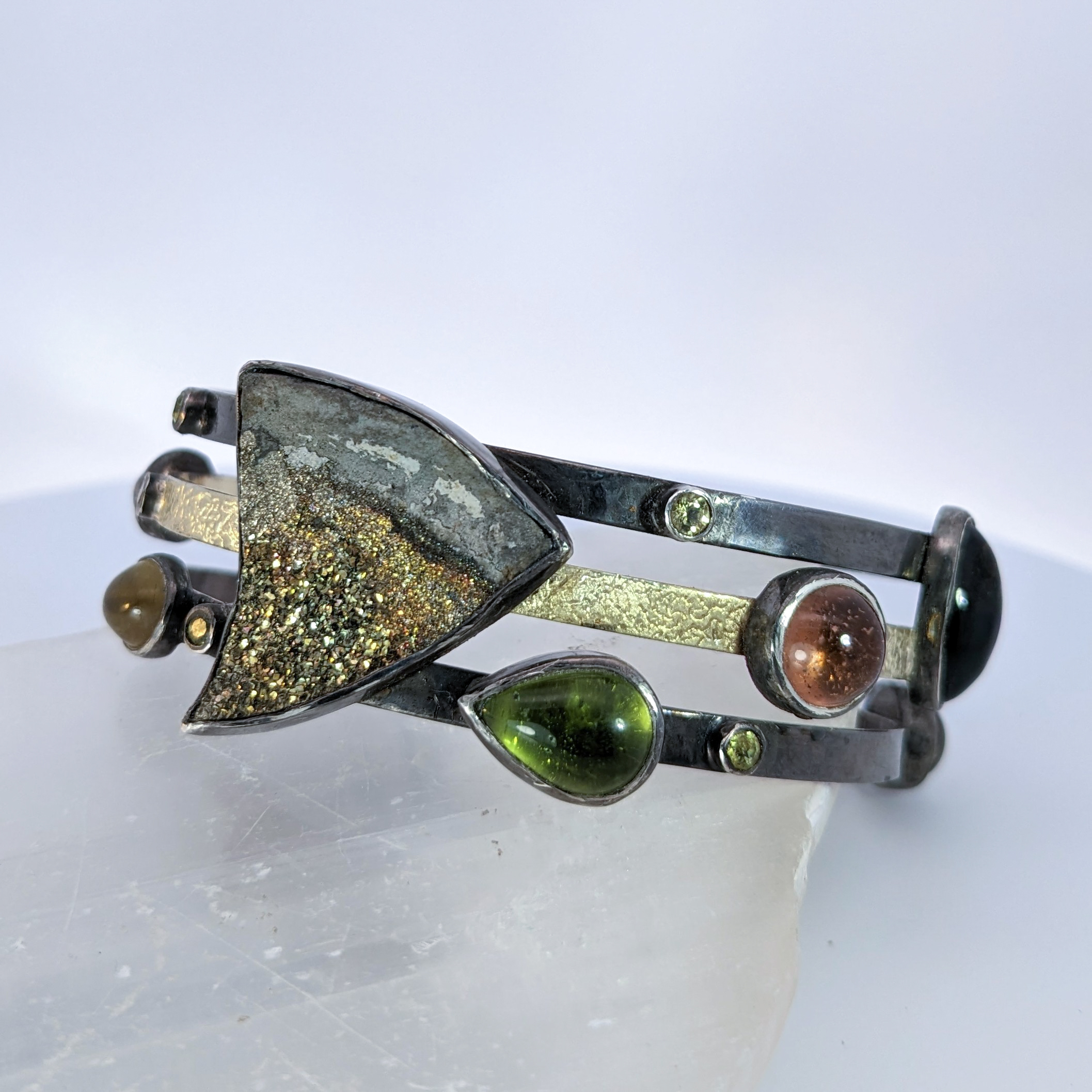 Rainbow Hematite, Tourmaline, Appetite, Sphalorite & Tsavorite Garnet Cuff Bracelet. 14k green gold & Black Rhodium on Sterling Silver.