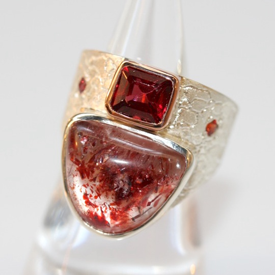 Custom crackle texture sterling ring, Strawberry quartz, emerald cut garnet and red spinel.