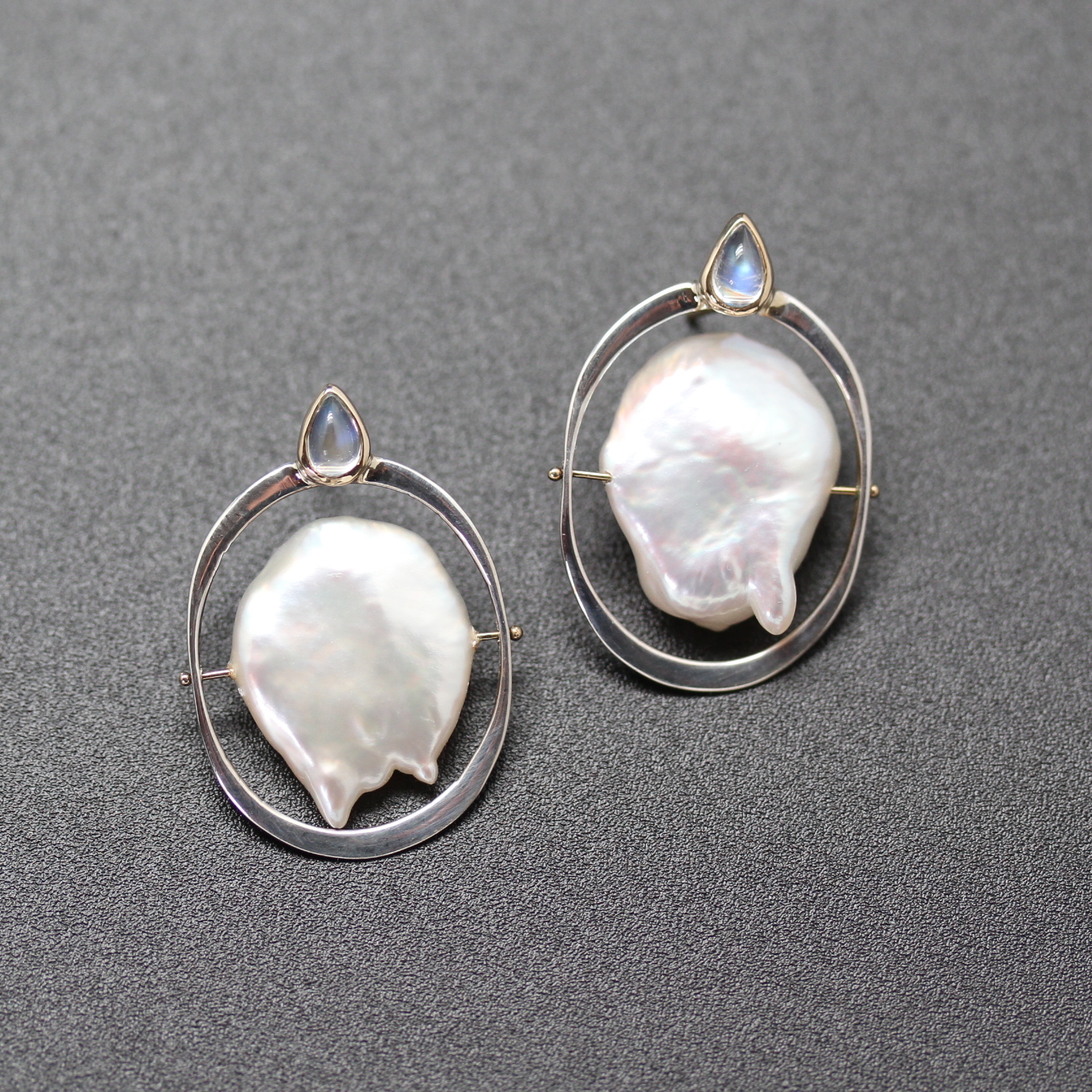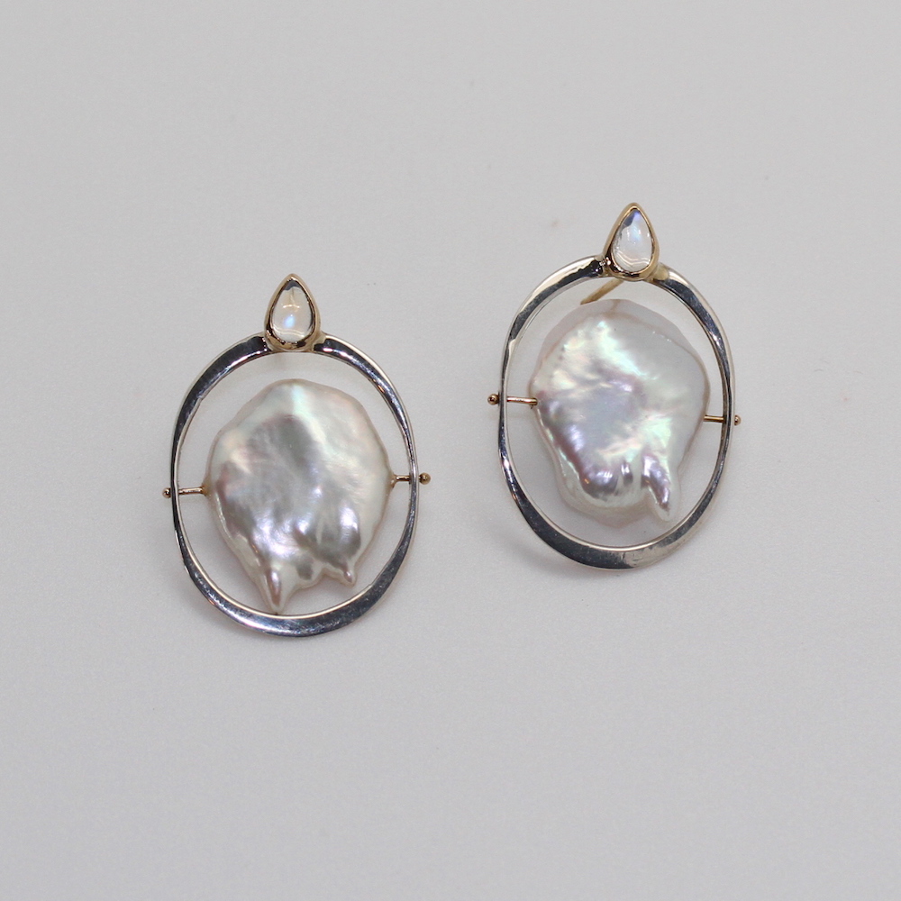Freshwater Pearl, Moonstone, 14KT yellow gold, forged sterling orbit.