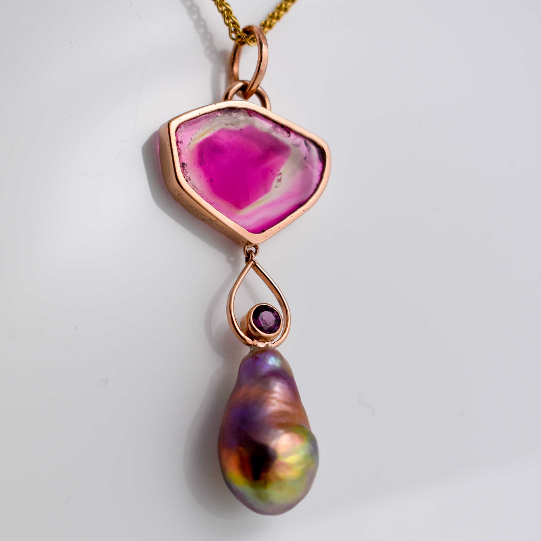 Watermelon Tourmaline, Garnet, Fresh Water Pearl Pendant. 14k yellow gold. 2.5″ long.