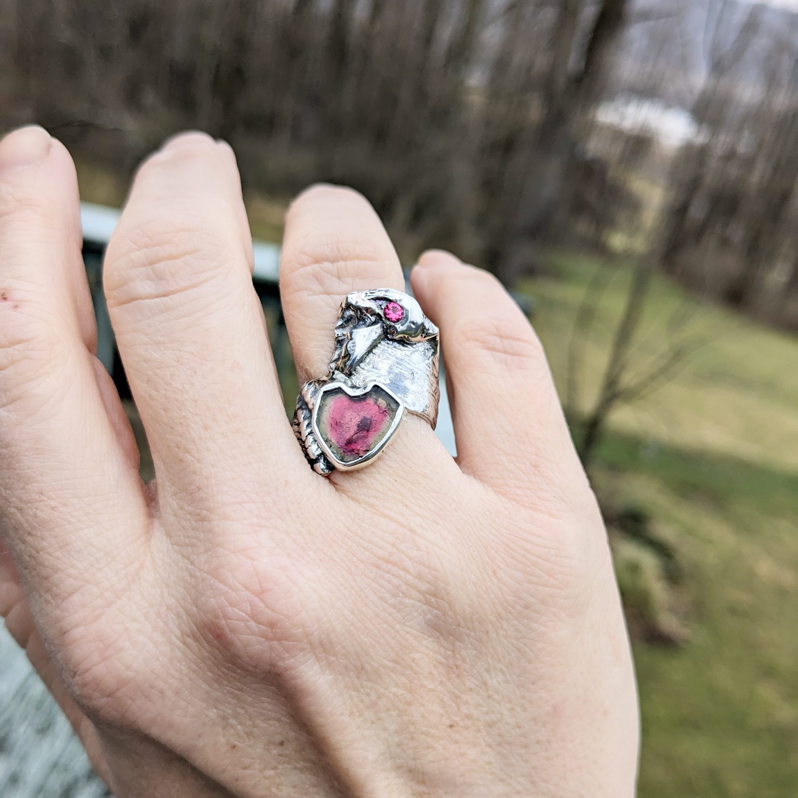 Rare natural heart shape watermelon tourmaline accented by pink spinel set in angelwing fragment of shell found on Sapelo Island, GA cast into sterling silver.