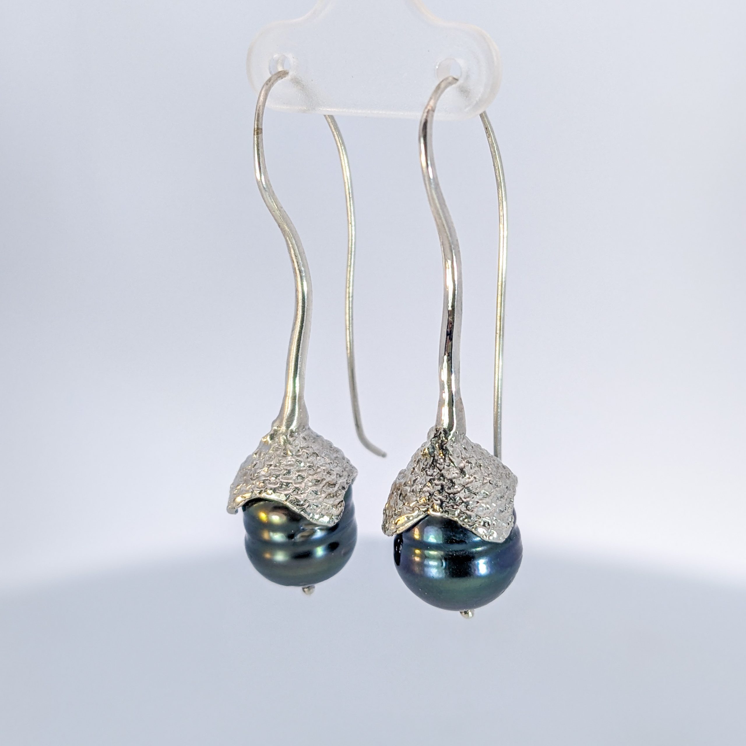 Wave Action Series, 13x12mm Black Tahitian Pearl Acorn top with wavy stem, sterling earrings 2″ long.
