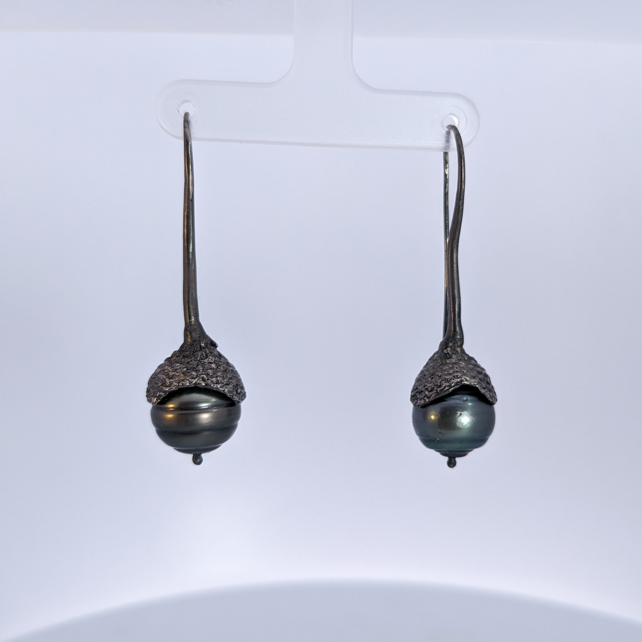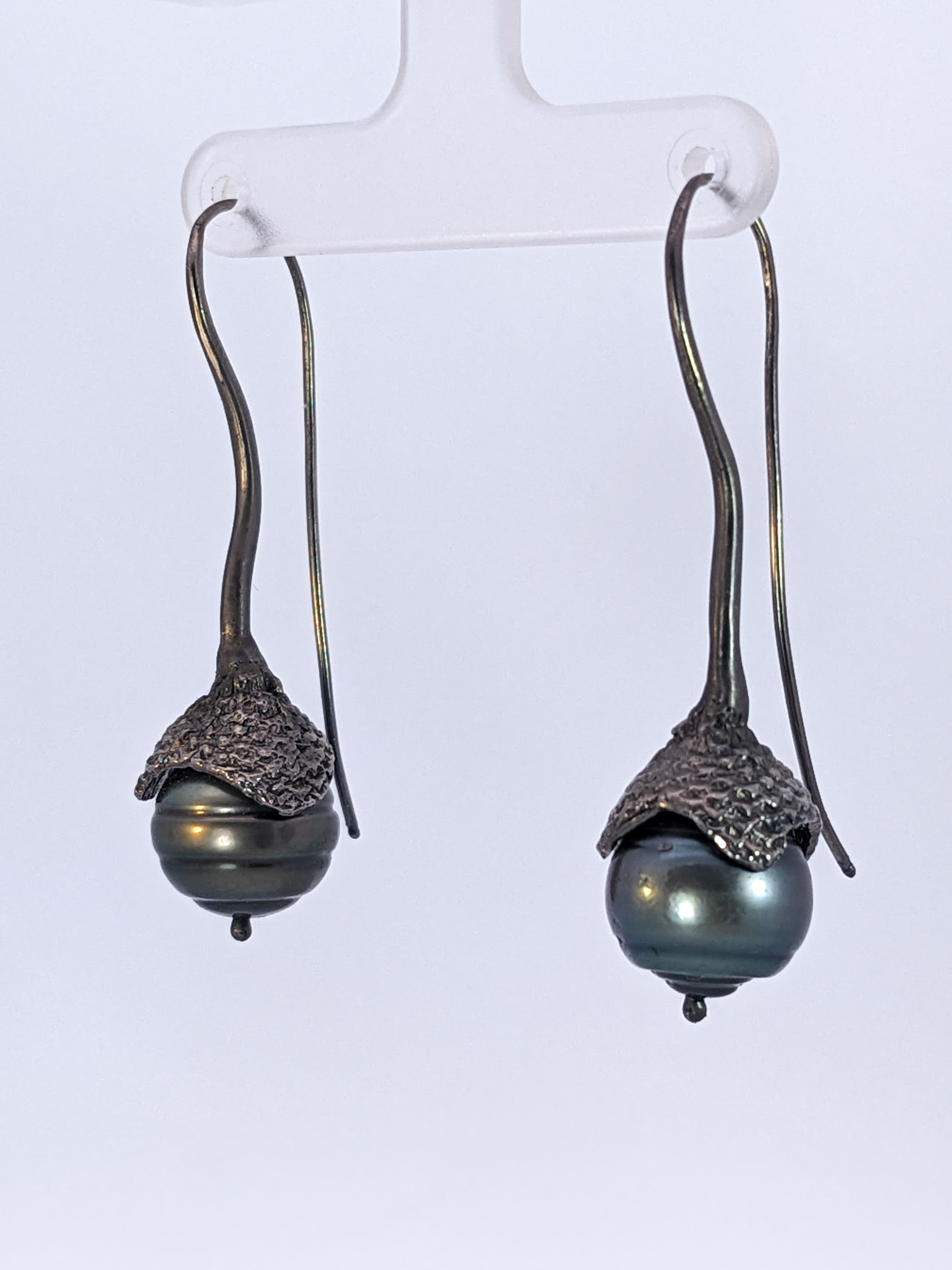 Wave Action Series, 13x12mm Black Tahitian Pearl Acorn top with wavy stem, oxidized sterling earrings 2″ long.