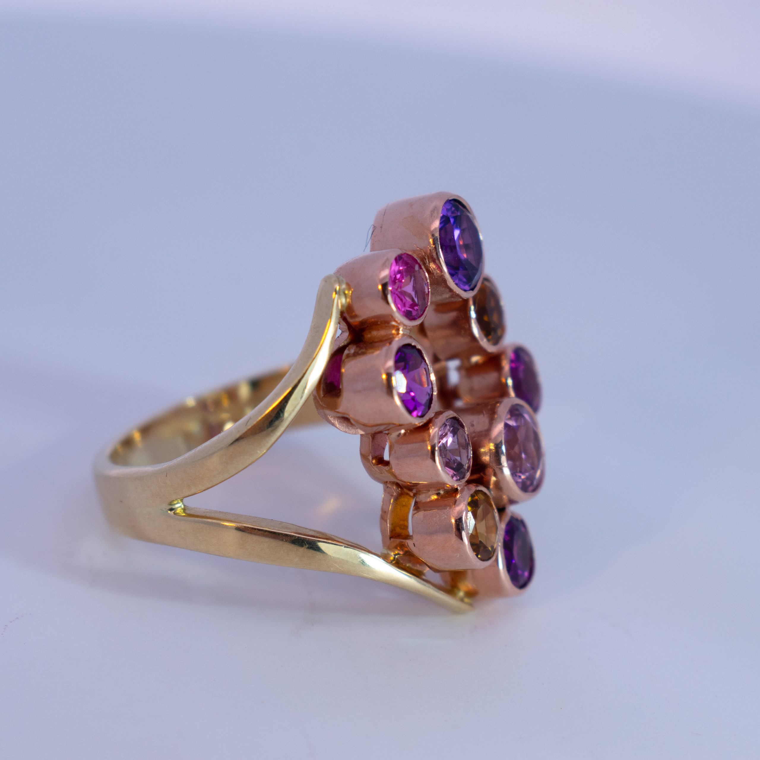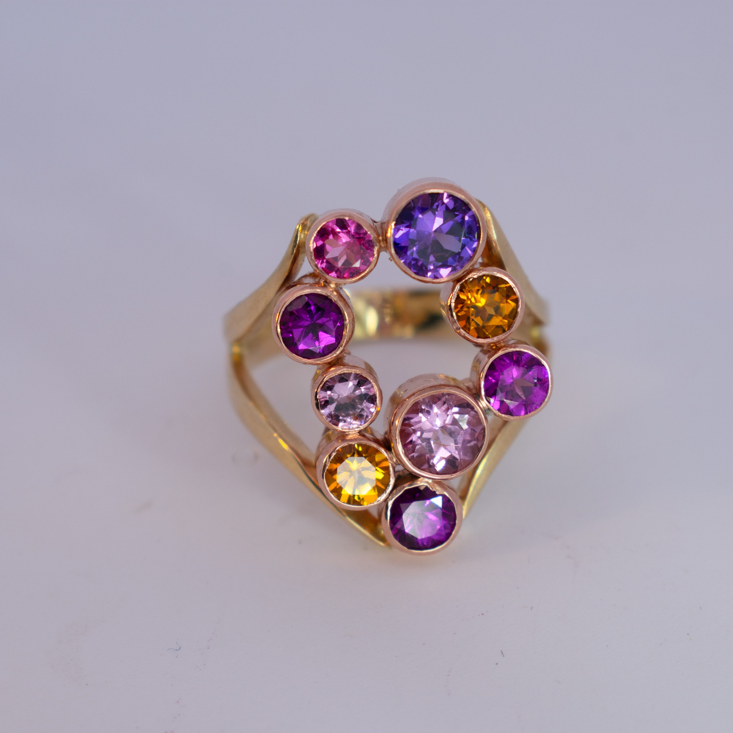 “Mozambique Garnet Ring” set with 7 magenta/purple Mozambique Garnet, 1 pink Spinel & 1 Amethyst, 14k Rose gold. Size 7.5